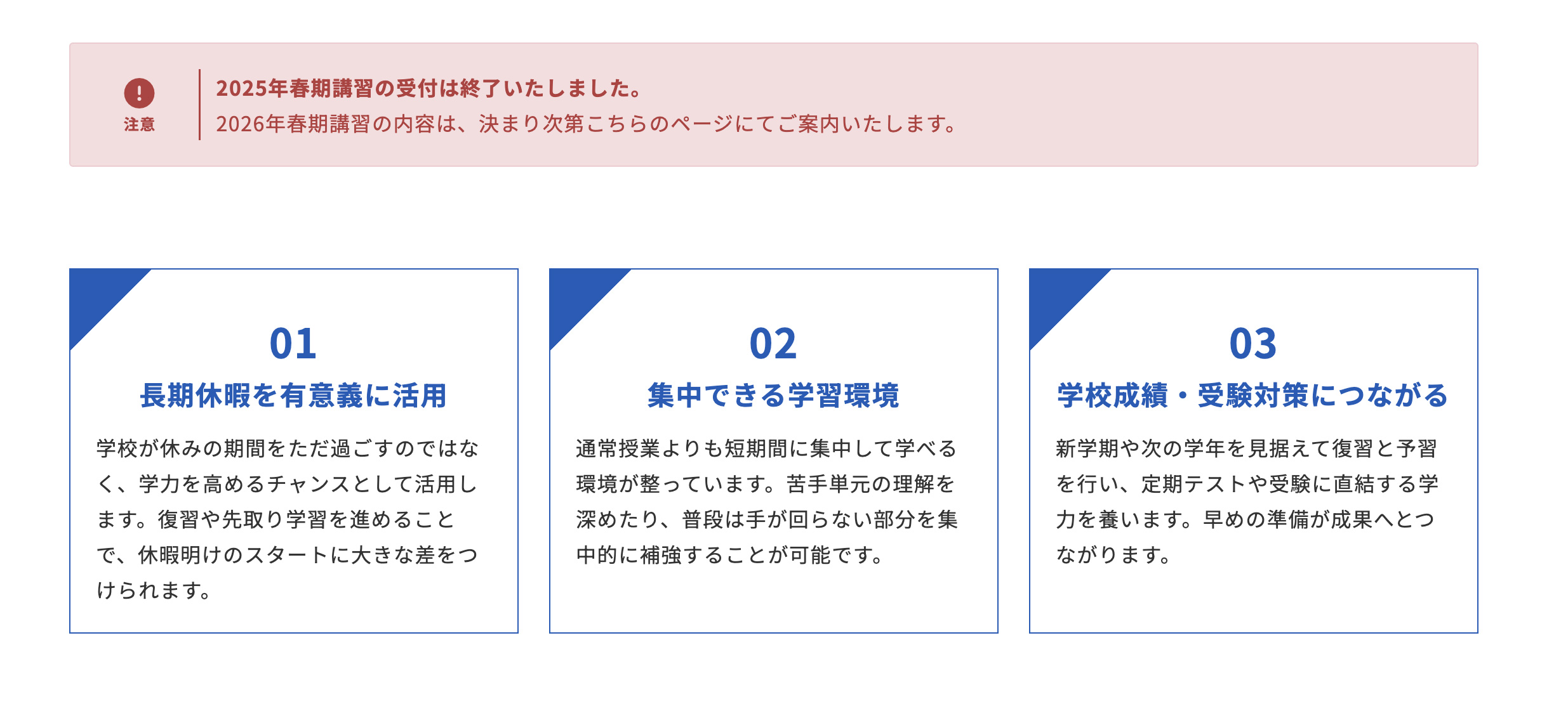 投稿記事が「講習・特別授業」カテゴリーの場合、[講習予約締め切り]の日付を設定すると、期日後は自動で『受付終了』のアラートを表示できます。申込状況の管理の手間が軽減します。